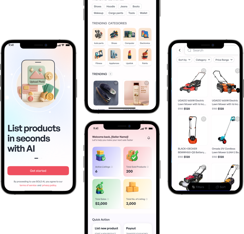 We developed Sold AI as a cross-platform mobile MVP using Flutter to deliver a seamless and responsive interface for sellers. Core features like AI-powered product listings, image recognition, and pricing suggestions were designed to make creating professional listings effortless and engaging.